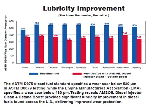AMSOIL Diesel 4-IN-1 provides better cold flow, increases cetane, fights fuel-system corrosion and cleans injectors to help restore lost power and torque and reduce smoke and emissions. Use it regularly to increase diesel fuel lubricity for improved wear protection.4 Maintain your diesel engine by adding AMSOIL Diesel 4-IN-1 to each tank to help clean dirty injectors and provide exceptional all-season protection and performance.